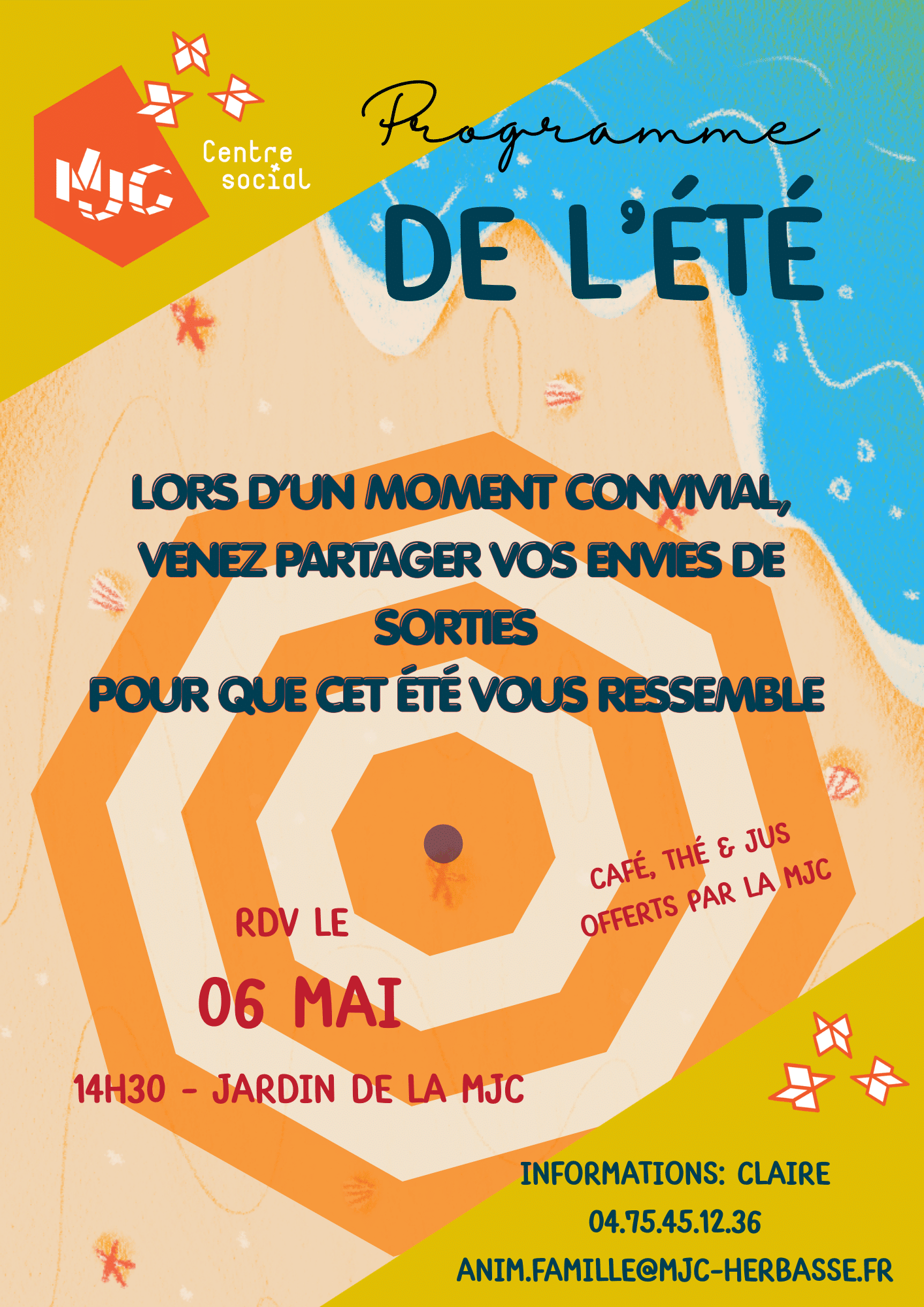 La MJC s’occupe des boissons, (thé, café, jus), vous pouvez apporter des petites gourmandises si vous le souhaitez !